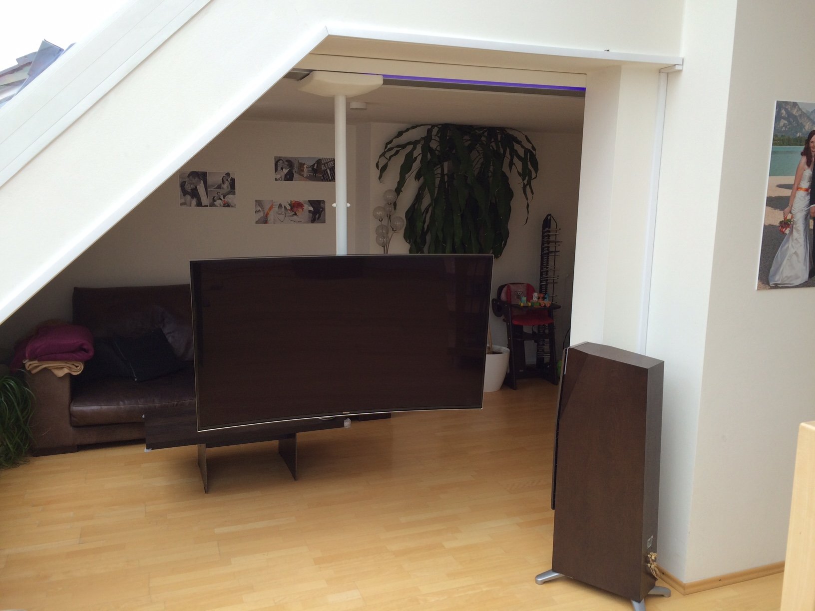 "Con la iluminación controlada a distancia, el televisor deslizante que flota bajo el techo se ve absolutamente futurista y es LO más destacado en nuestro hogar"